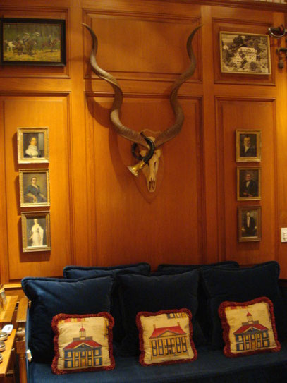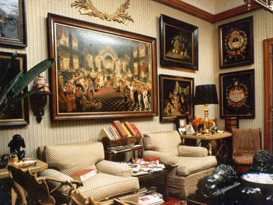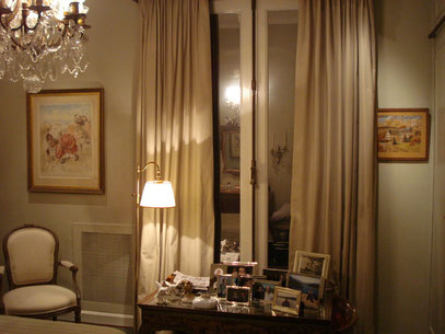 Se hizo una colocación de estos retratos de antepasados del dueño de casa y de los cuadros de la línea superior siguiendo la mandante simetría que daba el diseño de los paneles de la boiserie. Un trofeo de caza liga el conjunto. Como nota descontracturante, el cornetín que se colgó en la cornamenta. Abajo, el lit de repos, con dos filas de almohadones grandes, que lo hacen anatómicamente confortable como sillón. Los almohadones chicos están hechos con partes especialmente elegidas del género español de la cortina y el bandeau y los remata un marabú multicolor hecho con los colores del género. Arriba de la puerta se colgaron sables y espadas que entraban en el panel chico que remata.