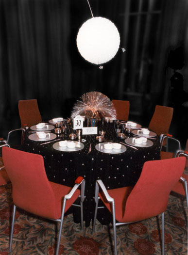 En unos adminículos plásticos de raro diseño - en realidad eran para cocer huevos en microondas – que simulaban vajilla para comer dentro de la ingravidez de una nave espacial, había sólo píldoras, cápsulas y grageas de formatos, tamaños y colores diversos, como si fueran el entendible menú de los astronautas estando en el espacio. Toda la “vajilla”, tenía el logotipo de la NASA. Los comensales reales comían “a la luz de la luna”, sobre unos individuales circulares, de un celuloide muy particular, que daba un aspecto muy tecnológico y que, en combinación con la luna y el centro de fibra óptica producían raros efectos visuales. Los sillones, de línea vanguardista, tenían luces coloradas que prendían y apagaban en sus apoyabrazos. Para los imaginados tripulantes, no había cubiertos: no les harían falta para comer ese menú tan químico.
