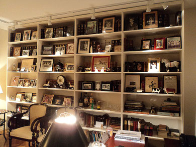 Rincón detrás del escritorio del dueño de casa, en el que se ven el costado derecho de la biblioteca y los cuadros que se colgaron debajo del cajón del taparrollo, con el sistema que se usó en toda la recepción: perfiles "J" de aluminio, ganchos y tanza de pescar incolora de mucha resistencia. El sistema descripto permite cambiar los cuadros de posición todas las veces que se necesite, sin afectar las paredes ni sus acabados en lo más mínimo.
