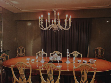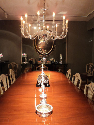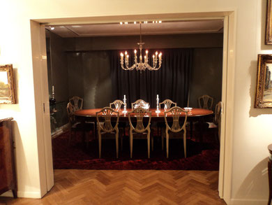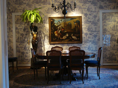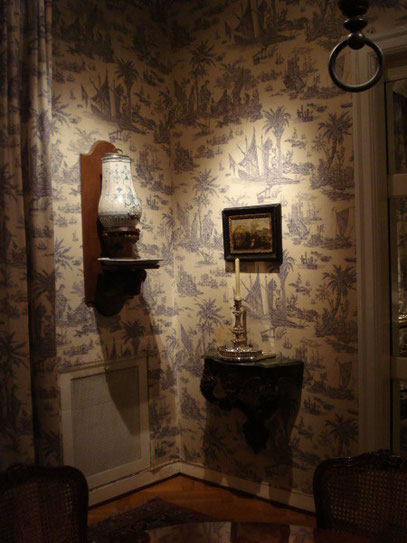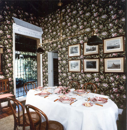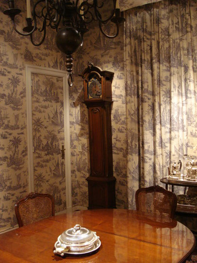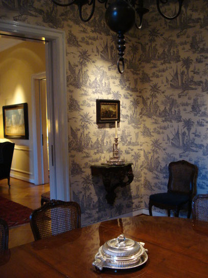 El comedor, que tenía una oscura y triste pintura rayé imitando boiserie hecha en la década del 60. Se lo enteló con Toile de Jouy de lino con estampado azul sobre fondo blanco. En el motivo se ve a conquistadores europeos llegando a América e intercambiando bienes y mercancías con los aborígenes. A la araña holandesa de época se la deselectrificó y se le pusieron velas naturales de un espesor, proporción y colorido determinados. Nótense las aberturas y zócalos pintados con esmalte brillante blanco, que aporta claridad y unidad entre los ambientes con tratamientos y acabados diversos. El centro de mesa es de plata sellada alemana.