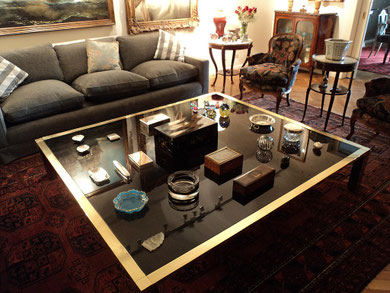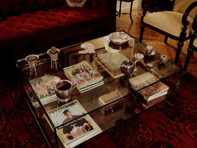 La mesa baja, con tapa superior y un estante, es absolutamente despojada de línea y fue hecha especialmente, a medida, sobre diseño, con vidrio pegado, así que no tiene nada metálico a la vista. La transparencia del vidrio permite ver los motivos de la alfombra con colores afines al sillón Chesterfield. Por todos lados, la constante aparición de cocobolos con plata, de la magnífica colección del padre de la dueña de casa.