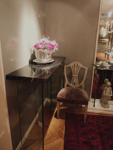 Este antiguo gabinete de estilo flamenco con alzada, vino de una propiedad rural de la familia del dueño de casa en Hellental, Alemania, en la frontera con Bélgica. Un funcionario condecorado por alguna acción nos mira desde un viejo óleo europeo y un loro de porcelana alemana, inquieto aletea desde el pie donde está parado. Las paredes y molduras típicas francesas del hall de entrada se pintaron con cuatro colores diferentes que remiten a viejos mármoles pero sin llegar a hacerlas de falso mármol, lo que las hace mucho más ágiles.