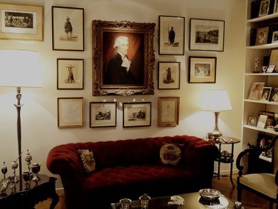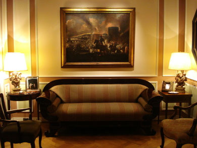 Los cuatro colores diferentes de las paredes y molduras enmarcan al viejo óleo sobre tela con tema bélico. El sillón Biedermeier, circa 1830, también proviene de la propiedad de la familia del dueño de casa en Alemania. Luego de restaurarse, se lo retapizó con una espectacular seda natural rayada tailandesa de Jim Thompson con un interesante tramado en relieve. Las lámparas fueron hechas con dos antiguas tallas policromadas representando elefantes, que los dueños de casa compraron en uno de sus tantos viajes a la India. Las pantallas de pergamino caldean la temperatura de color de la luz, que mezclada con la de las lámparas halógenas da una coloración conveniente y un mayor confort visual a la iluminación. Tanto la seda del sillón como las tallas con las que se hicieron las lámparas, tienen los mismos colores de las paredes y molduras, pero en otros materiales y con otra distribución.