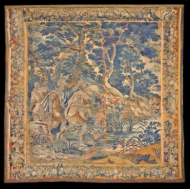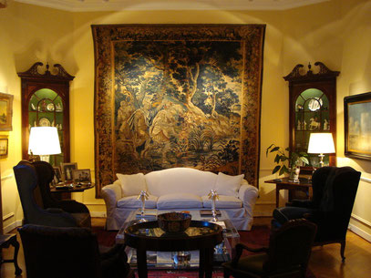 La antigua tapicería de manufactura flamenca es de fines del siglo XVII o de principios del XVIII. Representa una escena de cacería que se desarrolla en un bosque frondoso. Se ve a tres figuras atravesando un río, acompañadas por sus perros, una de ellas está soplando un cuerno de caza. Tiene una importante guarda tejida con rameados de flores y racimos de frutos. En esta casa, está siempre presente, de una u otra manera, el tema de la caza.