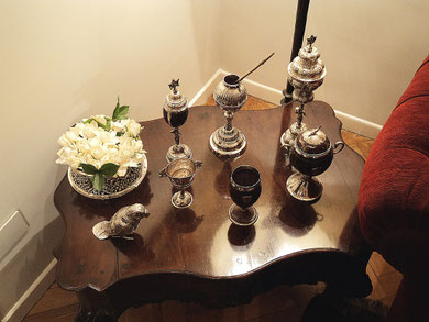A la derecha del paño de la chimenea y a la izquierda del sillón, y con una lámpara de pie Giacometti, está esta mesa baja luso brasileña con lindas piezas de platería criolla y europea: un bowl con su plato, para las flores, el loro, mates y cocobolos varios.