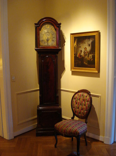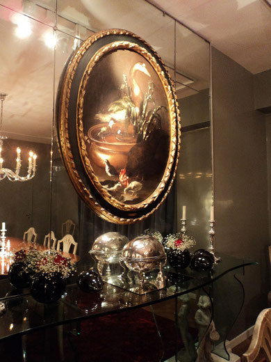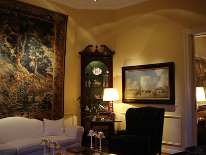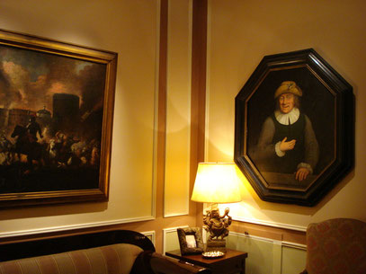 Sobre el paño más ancho de pared, entre la vitrina en ochava de la derecha y la arcada que da al hall de entrada, un magnífico cuadro holandés pintado por Herrmans, al óleo sobre tela, en el año 1671. El marco lustrado negro piano, con interna dorada a la hoja, evoca a los típicos marcos de los Países Bajos.