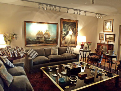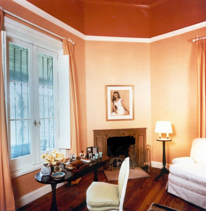 Una vista panorámica del living, donde al núcleo de conversación lo conforman los dos sofás de tres cuerpos y dos sillones franceses individuales Luis XV, vinculados a su vez por la gran mesa baja de bronce y vitrea ahumada con colecciones varias, la redonda del ángulo, muy poblada por portarretratos con fotos familiares y la francesa chica con tapa de mármol que está entre el sofá de la derecha y el sillón individual francés izquierdo, más una oval, también francesa, que sirve de apoyo a un plantero antiguo de porcelana. Entre las obras de arte, el papel protagónicolo lo tienen el gran óleo con tema marítimo y el otro gran cuadro con un típico retrato femenimo francés.
