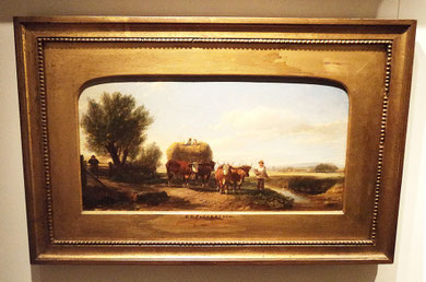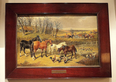Un típico cuadro del inglés John Frederick Herring Senior, 1795-1865, con una imagen muy descriptiva: un primero, segundo y tercer planos de granja y, al fondo una escena previa a la partida para una cacería del zorro, con las consabidas jaurías de Fox Hounds.