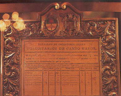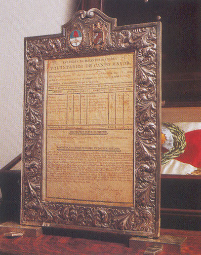 Foja de servicios del Libertador en el ejército español hasta 1804. San Martín era Capitán Segundo del Batallón de Infantería Ligera "Voluntarios de Campo Mayor". Se enumeran en ella el tiempo de sus servicios en cada grado y las circunstancias más salientes de su carrera. Está contenida en un artesanal marco de plata cincelada y esmaltada, con los escudos de la República Argentina y del Reino de España, donante de este importante documento.