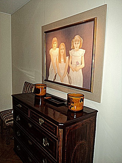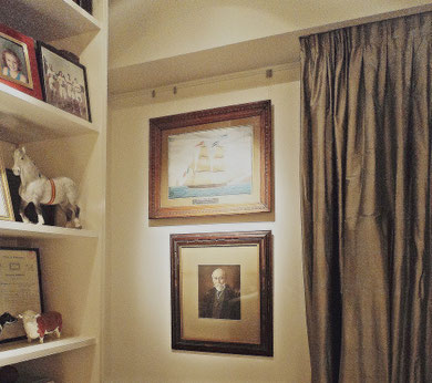 La pared de atrás del sillón, se armó con el retrato al óleo de un solemne personaje con pelo muy blanco, acompañado por dibujos y litografías de neto corte iconográfico, en las que pueden verse escenas costumbristas de la época de la colonia, trajes típicos, etc. De nuevo se generan tensiones entre los colores del retrato al óleo, el sillón, la alfombra y los objetos y encuadernaciones de la bibioteca.