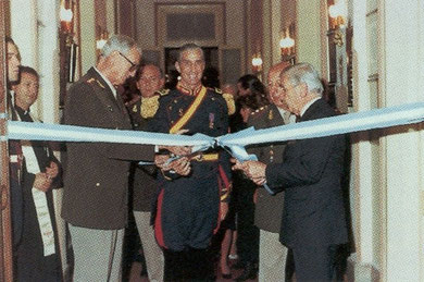 Una instantánea del momento del corte de la cinta con los colores patrios, durante la ceremonia de reinaguración del Museo del Regimiento de Granaderos a Caballo "General San Martín". Se ve en ella al Comandante en Jefe y al Segundo Jefe del Ejército, al Jefe del Regimiento y al Presidente de la Asociación de Amigos del Museo y Biblioteca del Regimiento.