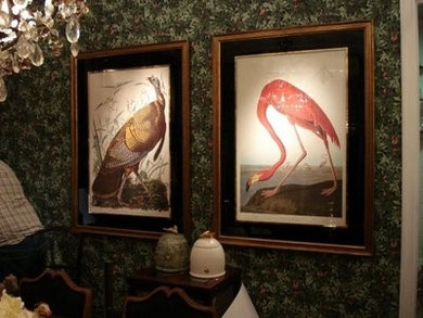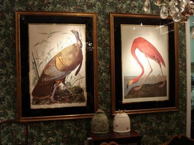 Dos litografías del famoso naturalista norteamericano John James Audubon (1785-1851), uno con el pavo salvaje macho de América del Norte y el otro con el flamenco rosado de todo nuestro continente. Las dos enmarcadas del mismo modo, con molduras doradas a la hoja, al agua, bruñidas, desgastadas y patinadas, vidrios negros y anchos filetes de oro, también a la hoja. En las paredes, papel Sanderson con hojas y pimpollos cerrados de Rhododendros cada tanto, sobre fondo negro.