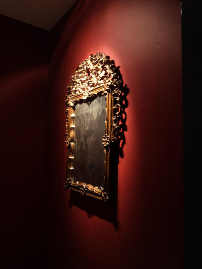 Los elementos protagónicos del palier principal son su color "sang de boeuf" y este antiguo espejo con marco dorado que, debidamente iluminado, contribuye a darle atmósfera.