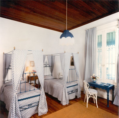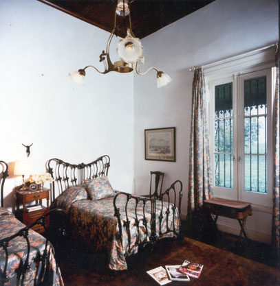 El cuarto de huéspedes, como casi todos los ambientes de la casa, tiene gran tamaño y cielorrasos muy altos. Una bonita araña Art Nouveau de tres luces se complementa con las lámparas de la mesa de luz y de un viejo mueble-panera provenzal para dar la iluminación general. Las dos camas de hierro de plaza y media caben por lo tanto cómodamente. El género de las cortinas, se repite en las colchas y almohadones. La suite de huéspedes se completa con un cómodo baño hecho poniendo especial cuidado en los detalles como para no desentonar con la época de la casa.