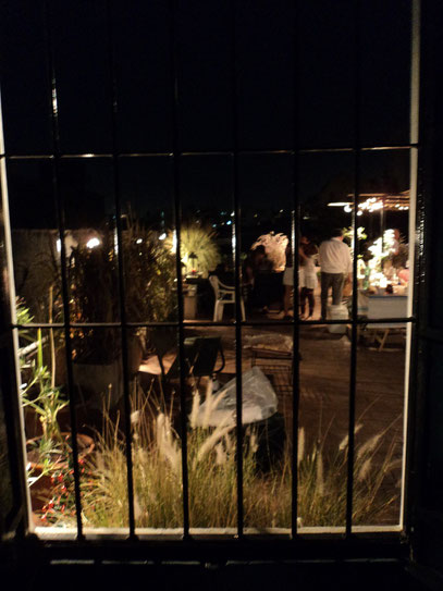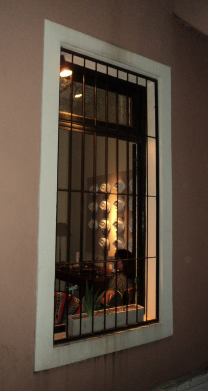 El comedor visto desde afuera, a través de su ventana, desde el enorme ventanal del pasillo que vincula la recepción con el toilette, el comedor diario y la cocina. Nótense la pared de color terracota, la moldura perimetral blanca y la reja negra. La iluminación halógena interior resalta las obras de arte de las paredes y las pone en valor.