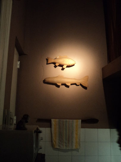 Un rincón de la cocina, que tiene doble altura y una losa que balconea sobre la parte específica de trabajo. Dos pescados tallados en madera con iluminación halógena de acentuación. Una vieja cuchara de madera hace las veces de toallero o soporte para colgar repasadores. La mesada de trabajo, las alacenas y la heladera están sobre la derecha. Sobre la izquierda, una mesa de trabajo, el microondas, la ventana y la puerta que da a la escalera que lleva a la amplia y cálida terraza del segundo piso. Las paredes son de color terracota, la cerámica y las aberturas, blancas. Los hierros de la reja y de la baranda que bordea la losa, son negros.