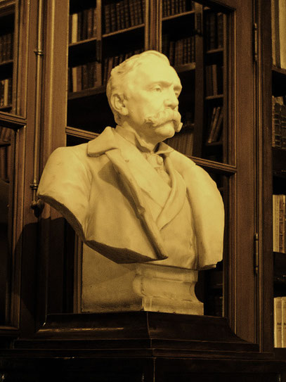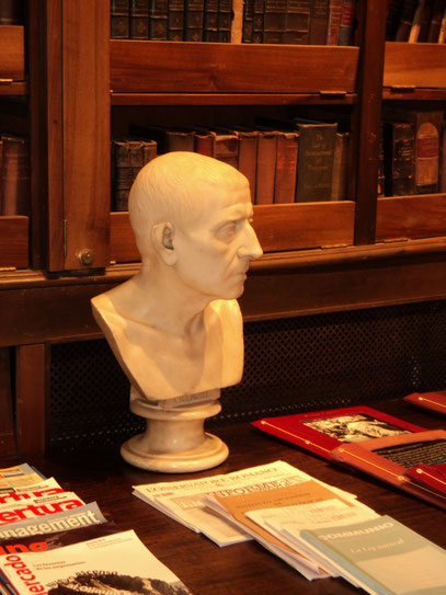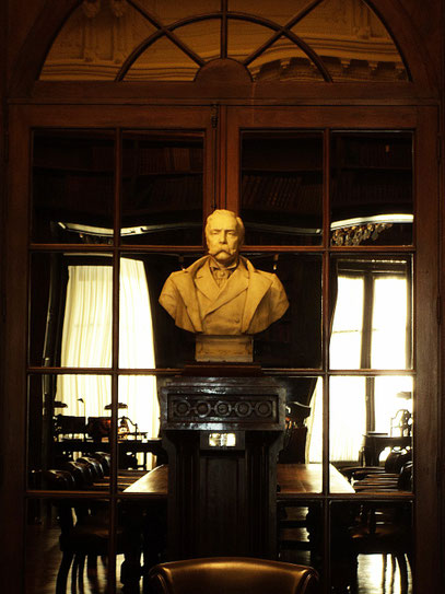 El magnífico busto de Carlos Pellegrini, hecho en mármol blanco por el escultor francés Coutan, parece controlar el salón de lectura que lleva su nombre.