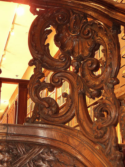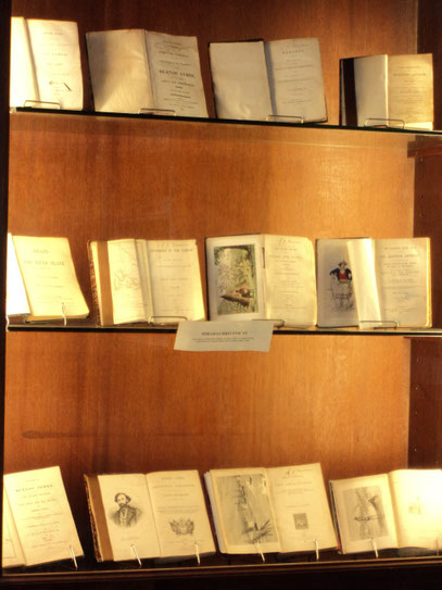 En las vitrinas de los costados del busto de Carlos Pellegrini, se hacen exposiciones temporarias temáticas de libros singulares, documentos históricos, incunables, grabados, etc.