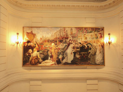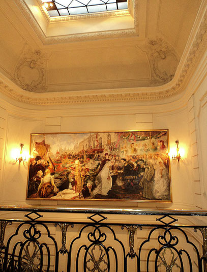 El gigantesco cuadro del pintor español Salvador Sánchez Barbudo, 1857-1917, fue donado al Jockey Club por D. Carlos Madariaga Anchorena. Debido a sus enormes dimensiones, cuando se lo quiso limpiar y restaurar, tuvo que hacerse ahí mismo y fue necesario armar un gran andamio compensando los desniveles de la escalera para que se pudiera trabajar con la comodidad indispensable para llevar a cabo las delicadas tareas de restauración.