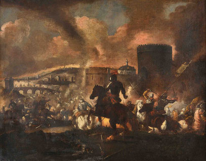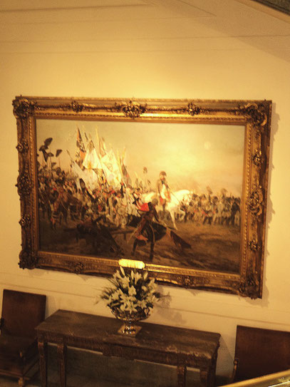 Atribuído al Círculo de Jacques Courtois, este "Asalto a una ciudadela" es un óleo sobre tela de 96 x 126 cm y tiene el correspondiente certificado extendido por M. Jean Dutey, "Expert des tribunaux françaises". Lució muchísimo mejor una vez que estuvo lista la nueva iluminación halógena de acentuación y tiene en él los puntos de partida para organizar cromáticamente el ambiente.