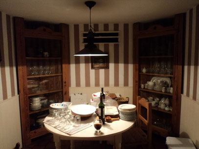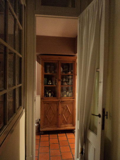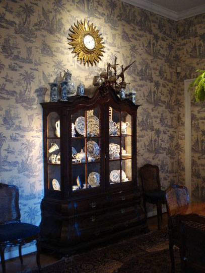 Viejo mueble de holandés cuya alzada tiene frente y costados con vidrio repartido. Adentro, una simpática colección de porcelanas azules y blancas de manufacturas europeas con mayoría de la de Meissen. Al fondo del mueble, que tenía un género visualmente complicado, se lo retapizó con un género azul, con una mínima trama, antimanchas, que pone en valor y destaca la colección de porcelanas. Las galletas de las sillas de comedor se tapizaron con el mismo género, belga de origen. Arriba del mueble, más cacharros azules y blancos y un viejo barco a vela que como el género de las paredes, recuerda la época de la conquista y la llegada a América de los antepasados del dueño de casa. El reloj, de porcelana blanca con marco en forma de rayos de sol dorados a la hoja, da las horas de las comidas.