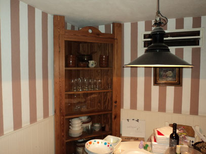 A las paredes, blancas, se les puso machimbre de madera y se lo pintó también blanco brillante, como la mesa, para hacerlo más lavable. Desde la parte superior del machimbre y hasta el ángulo de la pared con el cielorraso, se les pintaron a las paredes rayas anchas de color terracota. El ventilete da sobre la medianera, aporta buena ventilación y por sus dimensiones, no permite el paso de algún visitante inesperado. El pequeño cuadro que se le colgó abajo distrae la atención de la percepción del ventilete.