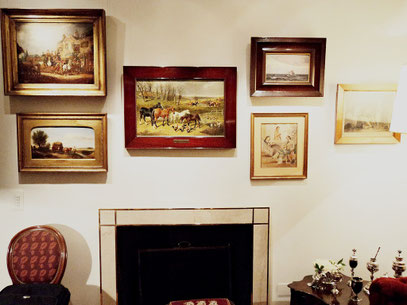 Una vista panorámica de la colgada de cuadros que se armó en la pared del escritorio que contiene a la chimenea. Como centro, se puso al cuadro de Herring Sr. que muestra la imagen anterior y a su alrededor se organizan imágenes de épocas, temáticas, tamaños, enmarcamientos y tratamientos diversos. Y todos conviven en armonía.