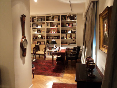 Un plano más cercano del escritorio donde se ve también la boiserie y parte de la biblioteca poblada de recuerdos y reminiscencias. La familia usa el escritorio intensamente desde que los cambios y la redistribución de elementos lo hicieron mucho más atractivo, acogedor y confortable. Hasta la acústica cambió en forma muy sensible al mejorar la parte textil.