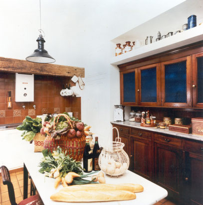 La cómoda cocina está conformada por una serie de nichos, unos con tapas y otros sin, y destinados a las distintas funciones y aparatos. El mueble antiguo que está sobre la derecha sirve para guardar de todo y también como mesada. En la mesa central se amasa y se arman las presentaciones de las fuentes que van a la mesa. La cerámica del piso es italiana, la lisa del nicho del fondo también y la guarda en relieve con animales mitológicos, es inglesa.