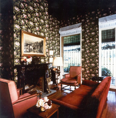 Se podría decir que el comedor tiene un lugar de fuego, que invita al diálogo en torno a sí, o bien que este living tiene una sector donde comer cómodamente. La chimenea es inglesa, de pizarra, pintada a fuego como falso mármol. Combinó casi exactamente con los colores del lindísimo papel y con los tapizados de los sillones, preexistentes, por pura casualidad, no porque se lo haya buscado.