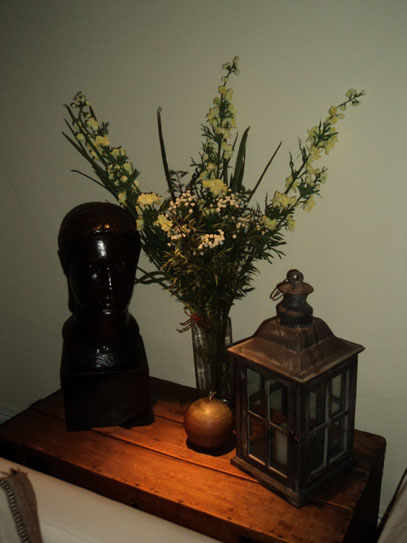 A cada paso el sello de la calidez de la dueña de casa. La luz del flash rompe el interesante clima dado con faroles con velas, velas y con la iluminación incandescente regulada.