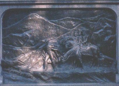 Uno de los relieves en bronce de un antiguo monumento que puede verse en la Plaza de Armas y el Jardín Histórico del Regimiento. En él se puede ver la evocación del Cruce de los Andes y el Libertador, en la escena, está desmontado, viendo y supervisando cómo avanzan sus tropas.