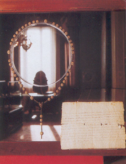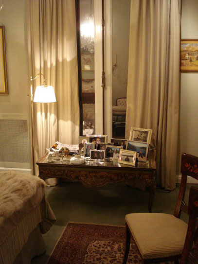Sobre la mesa veneciana, antigua, estucada, policromada, pintada a mano y con tapa de espejo maravillosamente trabajado, la cercana presencia de los afectos. El cuadro de la derecha es una imagen de la propiedad en Alemania. El género de la cortina, como todos los del dormitorio, es de origen natural y se repite en el cubre sommier.