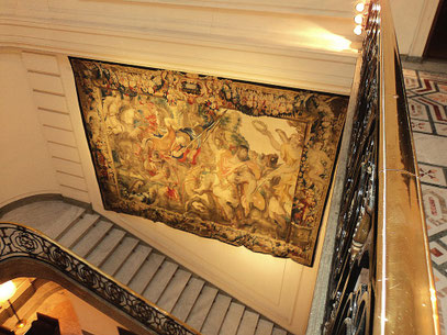 En esta foto, se ve la tapicería que cuelga en el vacío, sobre el tercio inferior de la escalera. Se la puede ver iluminada por los artefactos que se ven en la foto anterior, tomados de la parte de hierro de la baranda de la escalera. Desde los artefactos que se ven en esta foto, tomados de la baranda de la escalera, justo en el ángulo que conforma con la pared, arriba a la derecha de la tapicería, se ilumina el cuadro de François Flameng que cuela febajo del tercio superior de la escalera, en la planta baja. Los haces de luz se entrecruzan y llegan con las intensidades y tamaños necesarios a las zonas que deben iluminar a través de la distancia.