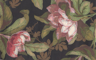 El papel, es un clásico diseño con magnolias que van del rosa viejo al bordeaux sobre un impactante fondo negro. A su vez, las magnolias combinan con hojas de varios tonos de verdes cálidos y unas enredaderas amarronadas que trepan entre ellas. Este papel, que parece pintado a mano, está hecho con gran calidad por la legendaria firma Sanderson. Este tipo de diseño disimula mucho los defectos de paredes muy viejas.