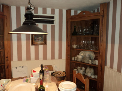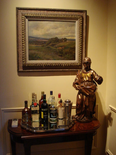 La antigua santa tallada y dorada a la hoja, desde su cómodo lugar al lado de la bandeja con alcoholes variados, se ocupa con su presencia vigilante de que no se produzcan indeseables excesos etílicos. La pintura con un paisaje campestre da serenidad y distiende el ánimo.