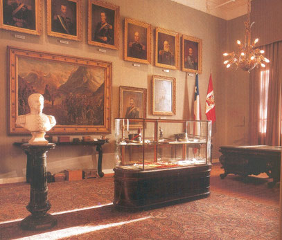 En esta imagen de la sala principal del Museo, pueden verse el busto del General San Martín, esculpido en mármol blanco por Duilio Mositoni; una vitrina hecha en Inglaterra en el siglo XIX, conteniendo documentos históricos, dos morriones y elementos varios ligados con la gesta libertadora americana; el escritorio que perteneció al General Julio A. Roca; los retratos de diferentes personajes ligados a las campañas sanmartinianas; el gran cuadro de Franz van Riel con San Martín dirigiendo a sus tropas en el cruce de los Andes; cofres con tierras de los distintos campos de batalla de la gesta emancipadora y banderas de países liberados por los Granaderos a Caballo liderados por el creador del Regimiento. Las arañas de bronce fundido y cincelado son Art Nouveau y la alfombra, de grandes dimensiones, es persa y antigua.