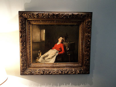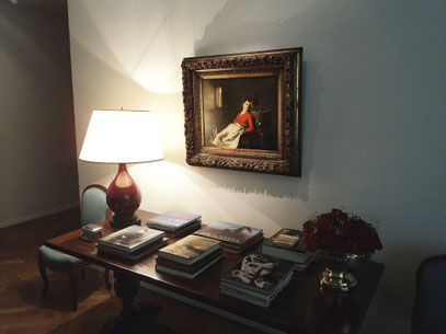Ya en el living, se puede ver este cuadro del francés Joseph Bail, 1862-1921, "enmarcado" por la mesa con la lámpara hecha con un potiche "sang de boeuf" y las rosas de la derecha, que hacen tensiones con el brillante color de la chaquetilla del chico del cuadro.