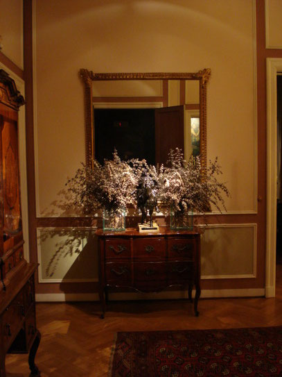 El gran espejo hace las veces de ventana en un lugar donde no la hay. Lo que en plástica se llama "horadar el muro". Sobre la cómoda de época, desde un interesante bronce ecuestre, el Emperador Federico Guillermo de Prusia avanza con gesto distante, altanero, emergiendo de en medio de un "monte" de una curiosa variedad de Eucaliptus hecha por botánicos japoneses. Los floreros que lo contienen forman un par idéntico. La alfombra es una lindísima Boukara.