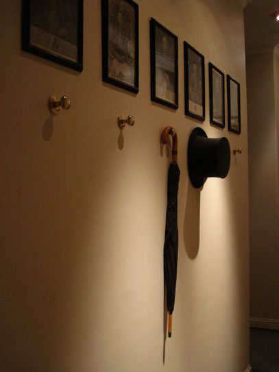 En el pasillo, antepasados del dueño de casa, desde una serie de antiguos grabados con sus retratos, vigilan que los abrigos de los huéspedes e invitados queden bien colgados en las perchas hechas a tal efecto con pomos de bronce de diseño propio.