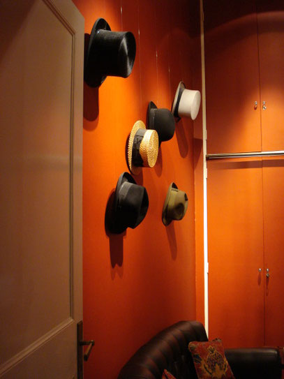 Más presencias familiares en esta composición hecha con sombreros, galera y rancho colgados a distintas alturas. En el sillón inglés de dos cuerpos, tapizado con cuero negro, los almohadones están hechos con partes elegidas especialmente del género inglés de la cortina y el bandeau.