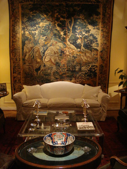 La indudable "píèce de résistance" de este urbano living, es la tapicería de lana y seda de la manufactura de Flandes, de finales del siglo XVII o principios del XVIII, que lo articula. Al sillón de tres cuerpos se le puso una funda clara que le suma luminosidad y juventud al ambiente, amén de quebrar un poco la formalidad que dan muebles tan "serios".