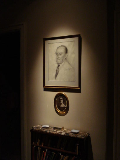 También en el nivel de la planta baja y colgando del paño de pared que coincide con el tercio medio de la escalera, está este retrato del Arquitecto Roberto Vásquez Mansilla hecho por el pintor