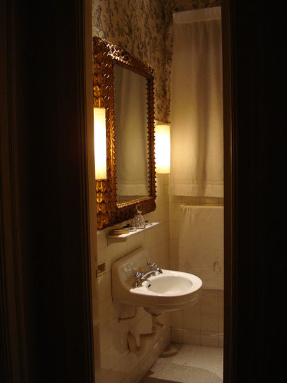 En el toilette se conservaron las viejas cerámicas y molduras blancas inglesas. El empapelado imitando Toile de Jouy, tiene monos y flores, aludiendo respectivamente a los gustos del dueño y de la dueña de casa. Al marco peruano tallado y dorado a la hoja se lo trajo desde otra parte de la casa. A ambos lados del espejo, artefactos de diseño propio revestidos con pergamino de cabra. Su luz se complementa con la halógena que llega desde artefactos embutidos en el cielorraso, también empapelado, como las paredes. Cortina y toalla italianas de hilo hechas al modo de las antiguas.