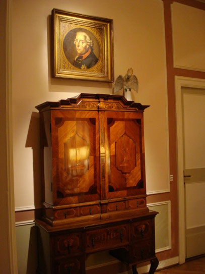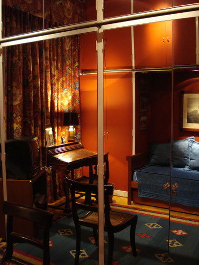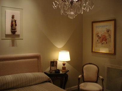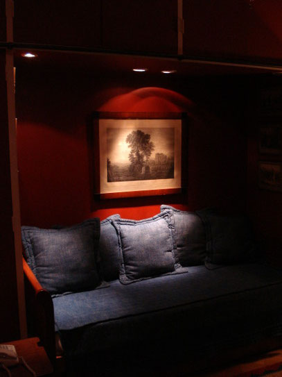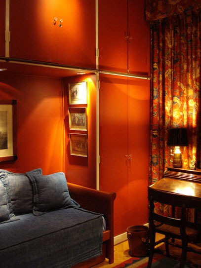 La lit de repos está metida casi del todo en el nicho que conforman los placares de los lados y de arriba. Tres muy coloridos grabados antiguos con temas militares, de una serie de seis, cuelga a cada costado de la cama. Al fondo del nicho un importante grabado antiguo con tema de un bosque y marco enchapado en raíz.