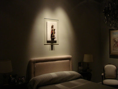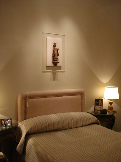 La figura del Niño Jesús de Praga, puesta en valor sobre un taco entelado y ese taco a su vez montado sobre una ancha y espesa placa de acrílico incoloro que parece cristal de roca. La cama tiene su respaldo tapizado con un género chileno hecho a mano, con una rara técnica del siglo XVIII, sin trama ni urdimbre. Las dos medias mesas de luz, alguna vez fueron una sola.