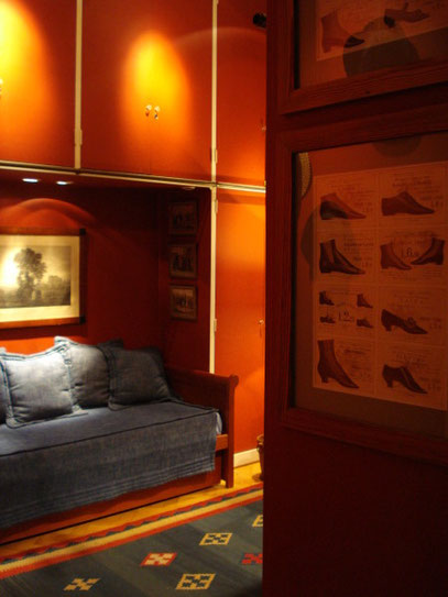 El cuarto de vestir tiene un clima masculino y no por eso es frío o no acogedor.Todo lo contrario: la gama de colores es predominantemente cálida. Puede usarse también como cuarto de TV o de huéspedes, con capacidad para "dos nietos cómodos". La doble fila de almohadones cuadrados hace que el lit de repos sea utilizable como un cómodo sillón. El género es inglés.