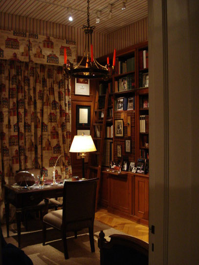 El escritorio tiene una atmósfera cálida, alegre y muchísima vida. Está poblado de recuerdos, evocaciones, de regalos recibidos por los dueños de casa, etc. La cortina y el bandeau están hechos con un género español con diseños arquitectónicos. Hay dos sillones de uno y otro lado del escritorio. Se los unificó con el mismo género al tapizarlos. Al lado de la puerta de acceso, hay un lit de repos y un sillón, ambos tapizados con un género inglés del tipo del corderoy de un color azul muy especial. El plano horizontal del cielorraso y toda la banda vertical de los costados, fue empapelado con un papel a rayas con colores tomados del género español con motivos arquitectónicos de la cortina y el bandeau. El papel es un factor unificador de los distintos elementos de la boiserie, de la biblioteca y de los cuadros y recuerdos que las pueblan. El sentido de la direccionalidad de las rayas se ubicó de manera tal de que agrandara visualmente el ambiente. El empapelado arrranca desde el remate superior de la boiserie y es notable como alegra el ambiente y el efecto general del lugar.