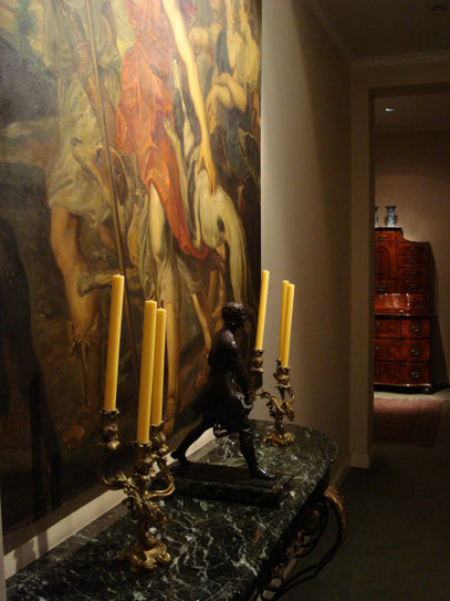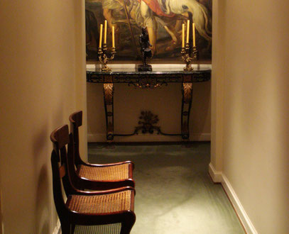 El dueño de casa, gran aficionado a la caza mayor, ni sospechó que, al entrar a este departamento por primera vez, se la encontraría a la Diana Cazadora de Rubens esperándolo como parte de la boiserie del que iba a ser su escritorio. Y Diana, como diosa de la Caza, no se hizo rogar demasiado tiempo para aceptar bajarse de la boiserie y ponerse medio exhibicionista, en pose, en el cruce del pasillo en "T". Y el dressoir de hierro con tapa de verde mámol, con lindos candelabros de bronce de tres luces cada uno y la escultura de bronce, parecen dispuestos para rendirle culto a la Diana de Pieter Paulus.