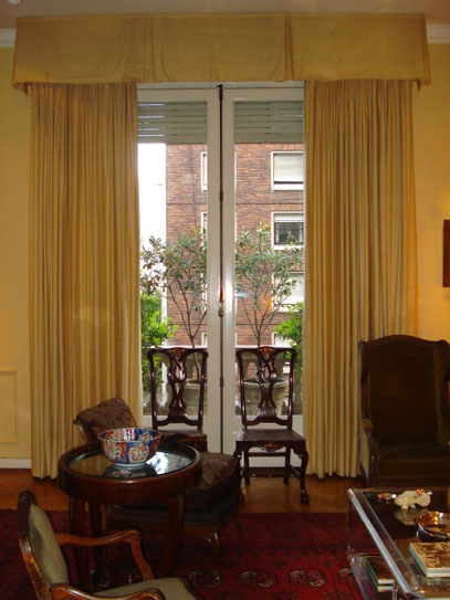 En el living se eliminaron las molduras superiores para "dar aire"y alivianar. Y todo se pintó con un amarillo uniforme, hecho a partir del género de la cortina y el bandeau de seda rústica de la India y el fondo de seda de la interesante tapicería que articula el ambiente. Todos los contramarcos y zócalos se pintaron blancos, buscando marcar las aristas, lo que visualmente amplía los diferentes ambientes y los unifica a pesar de los distintos tratamientos, coloridos y acabados. El antiguo Grand Father clock inglés, circa 1800, fue puesto en diagonal buscando acompañar la posición que tenían las dos vitrinas preexistentes. Con el típico cuadro europeo con una escena doméstica del siglo XIX y la silla con tapizado a rayas, forman un grupo y le dan interés y atractivo a una de esas esquinas "tierra de nadie", que de no tener estos elementos, pasaría totalmente inadvertida.